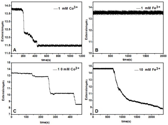 - DNA condensing force by hydrolysed Fe3+ and Al3+ is weaker than those by neutral La3+ and Co3+, and there are no stepwise jumps, but there is continuous shrinking in the pulling curves. Due to hydrolysis of Fe3+ and Al3+, pH variation not only regulates DNA charge but also plays a role in binding of the ions to DNA.