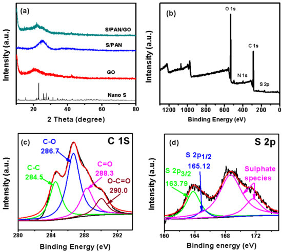 The X-ray diffraction (XRD) patterns of sulfur (S), graphene oxide (GO), sulfur/polyacrylonitrile (S/PAN) and sulfur/polyacrylonitrile/graphene oxide (S/PAN/GO) composite are shown in black, red, blue, and green, respectively, in Figure 1a. In the pattern of S/PAN, the characteristic peaks of elemental sulfur disappear, indicating that fine sulfur particles exist in a highly dispersed state in the PAN matrix, and the crystal sulfur transforms into amorphous sulfur by the heat treatment. Compared to S/PAN, the XRD data of S/PAN/GO shows a new peak at 20° corresponding to the characteristic peak of graphene oxide, which proves that graphene oxide has been successfully added to the material (S/PAN/GO) [15,30,31]. The X-ray photoelectron spectroscopy (XPS) spectrum of S/PAN/GO is shown in Figure 1b, confirming the presence of O (535 eV), C (286 eV), and S (168 eV) elements. Furthermore, the C 1s spectrum of the S/PAN/GO (Figure 1c) has four peaks centered at 286.7, 284.5, 288.3, and 290.0 eV, which are attributed to C–O, C–C, C=O, and O–C=O bonds, respectively [32,33,34,35]. The S 2p peaks (Figure 1d) are attributed to the two forms of sulfur. The first peak comprises of two distinct peaks at 163.79 and 165.12 eV corresponding to the 2p3/2 and 2p1/2 of the –C–S– covalent bond [34,36]. The second peak (168.7–171.2 eV) corresponds to a sulphate or sulfonate species [37].