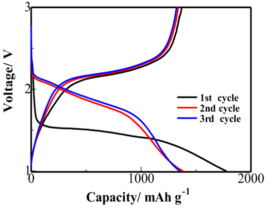 The profiles of galvanostatic discharge/charge tests of the S/PAN/GO cathode at a 0.2 C rate are depicted in Figure 5. The initial discharge capacity of the S/PAN/GO composite is 1776 mAh·g−1, which is much higher than the high theoretical specific capacity of sulfur (1675 mAh·g−1) owing to the irreversible insertion of lithium [13]. It can be seen that, the main plateau (1.3–1.6 V) appears in the discharge profile of the first cycle, which could be attributed to the key electrochemical reaction in Li/S battery. In the second and third cycle profiles, the reversible discharge capacity is 1379 and 1354 mAh·g−1 and the plateau appears at 1.7–2.2 V. Theoretically, a typical Li/S battery discharge curve should consist of two plateaus corresponding to a two-step reaction between lithium and sulfur. The first plateau, in the present case, was attributed to the reduction of the S8 ring and the formation of S82− and the second plateau was related to the reaction of Li2Sn (4 ≤ n ≤ 8) to short-chain sulfide species (Li2S2 and Li2S) [38]. Nevertheless, voltage plateau of discharge profiles in the S/PAN/GO composites are different from those of elemental sulfur/carbon composite cathodes [25,26,29], which may result from the interaction between sulfur and PAN. The interaction between sulfur and PAN leads to the formation of a covalent bond between sulfur and carbon (S=C) in the PAN backbone, and this affects the interaction of sulfur with lithium. Additional energy is consumed to dissociate sulfur from the covalent bond (S=C), leading to a more negative potential [13,39].