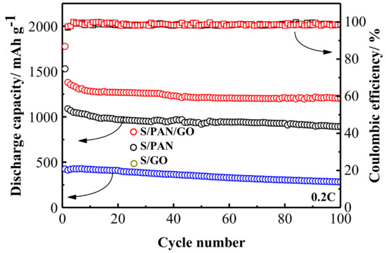 Figure 6 displays the cycle performances of the S/PAN, S/GO, and S/PAN/GO composite cathodes at 0.2 C, respectively. The freestanding S/PAN/GO electrode delivers a high initial reversible discharge capacity of 1379 mAh·g−1, which is 290 mAh·g−1 higher than that of the S/PAN electrode and 950 mAh·g−1 higher than that of the S/GO electrode. It indicates that the sulfur/polyacrylonitrile (S/PAN) composite cathodes effectively curbed the shuttle effect and increased the utilization of active material. Graphene oxide (GO) successfully improved the conductivity of the electrode and enhanced the mechanical properties and structural flexibility for S/PAN/GO composite cathode. The S/PAN/GO composite cathode retains the discharge capacity of 1205 mAh·g−1 over 100 cycles, which accounts for ~87% capacity retention. In addition, the S/PAN/GO composite shows the average coulombic efficiency ~100% over 100 cycles, which could be due to suppression of the shuttle effect. However, S/PAN composite cathode maintains the reversible capacity of 894 mAh·g−1 after 100 cycles and the S/GO composite cathode retains the reversible capacity of 282 mAh·g−1.