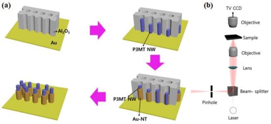 (a) Fabrication process of hybrid P3MT/Au NWs using template method; (b) PL and Raman measurement using laser confocal microscope (LCM).
