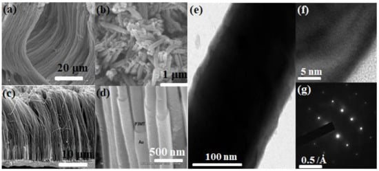 SEM images of the side (a,c,d) and top (b) views of P3MT (a,b) and P3MT/Au NWs (c,d) after removal of the Al2O3 nanoporous template; (e,f) TEM images of P3MT/Au NW; (g) SAED pattern from the cladding area of (e,f).