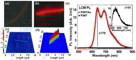 We investigated the nanoscale solid PL characteristics of the P3MT and the P3MT/Au NWs using color CCD and LCM system with an identical experimental condition. Figure 4a,b is PL color CCD images of a P3MT NW and a hybrid P3MT/Au NW, respectively. A weak emission from the isolated P3MT NW was observed, which could be explained by the doping effect (Figure 4a). It is well known that PL in highly doped conducting polymers is quenched due to the non-radiative recombination of exciton through polarons and bipolarons. After a while, after wrapping the P3MT NWs in Au, the emission of the P3MT/Au dramatically brightened, together with the red-shifted emission wavelength (Figure 4b). Figure 4c,d shows the images of three-dimensional (3-D) LCM PL intensity measured from an isolated P3MT NW and P3MT/Au NW, respectively. The Y-axis is the measured voltage of the sensor corresponding to the PL intensity. The measured voltage in the pristine P3MT NW (Figure 4c) was 7~9 mV, whereas it was 1.1~1.3 V in the P3MT/Au NW (Figure 4d). This is two orders higher than that of P3MT NW. The full spectrum of PL on P3MT/Au NW is shown Figure 4e, in which the black line is the spectrum of P3MT NW. The inset figure of Figure 4e is an enlarged PL spectrum of P3MT NW. Two emission peaks at around 640 nm and 685 nm in the P3MT/Au NW were clearly observed, which is in contrast with the single PL peak at around 544 nm in the P3MT NW. The two emission peaks of P3MT/Au NWs were at 96 nm and 141 nm—red-shifted compared to the maximum PL peak at 544 nm of P3MT NW, respectively—and the intensity showed a 170-fold enhancement compared with the maximum intensity of the P3MT. The cause of PL enhancement might be due to the Au wrapping the surface of the P3MT NWs with a thickness of 10 nm, which leads to strong enhancement of the radiative decay rate of the P3MT NWs through the resonant coupling of surface plasmons of Au with excitons in the P3MT NWs.