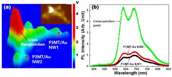 So far, we have probed the optical properties of the coaxial-like structured P3MT/Au NWs, in which the PL was observed from an individual NW. In general, the PL shows a linear increment as the number of emissive layer or amount of materials increases. However, we knew that there was a singular point in the PL intensity at which the heterostructured P3MT/Au NWs overlapped each other. Figure 7a is a representative PL mapping image observed from the overlapping structure of P3MT/Au NWs. The PL intensity is visualized as a 3-D LCM PL image with the unit of voltage corresponding to the PL intensity. It is interesting that the PL intensity of the cross-junction point was abnormally high even if considering the number of overlapped wires, which contrasted with that from the remaining area of NW1 and NW2. Moreover, this was ubiquitously observed throughout the whole sampling area. The inset of Figure 7a showing the integrated PL intensity also demonstrates that the cross-junction point is much brighter than other parts. The maximum value of measured voltage on the cross-junction point was 4.1–4.9 V, whereas that on the P3MT/Au NW1 and NW2 was 1.2–1.4 V. Figure 7b shows a comparison of the full PL spectra measured from the cross-junction point and the other NW area. The shapes of the PL spectra are similar. However, the PL intensity at the cross-junction point is more than three times higher compared with that measured from isolated P3MT/Au NWs (Figure 7b). The strongly enhanced field between the Au nanostructures fabricated like bowties induced molecular PL enhancement followed by the increment of quantum efficiency. The cross-junction point is analogous to the bowtie structure. Accordingly, the overlapping of P3MT NWs provides the synergy effect that the strongly enhanced field on the emissive decay of exciton. This might lead to the further enhancement of PL along with the resonance between the localized surface plasmons of the cladding Au and the absorption wavelength of P3MT [42,43].