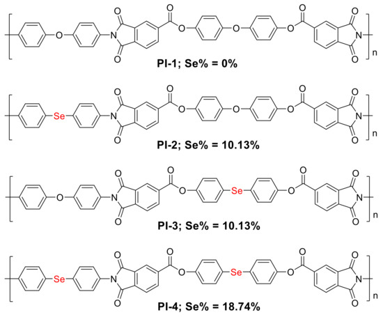 The structures of four polyimides (PIs) with different contents structures; Se% indicates the theoretical mass contents.
