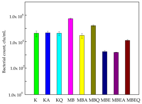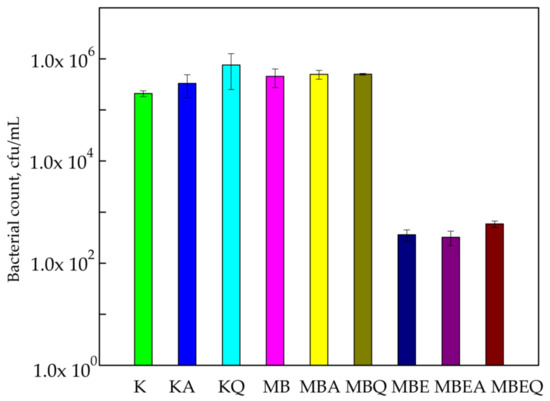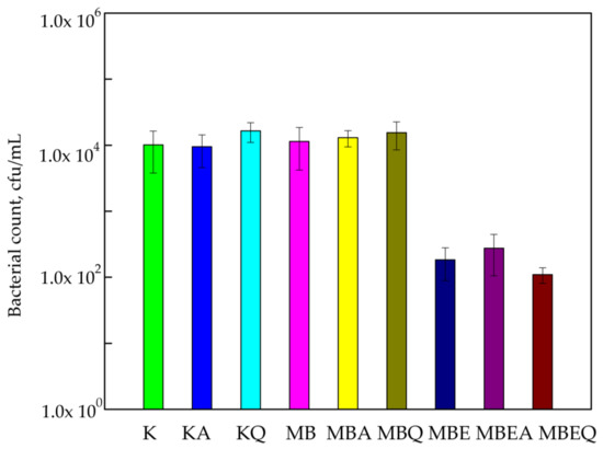 The influence of coatings on S. aureus growth. K—polylactic acid (PLA) film; KA—UV-A irradiated PLA film; KQ—Q-SUN irradiated PLA film; MB—PLA film, covered with methyl–hydroxypropyl–cellulose (MHPC)/cocoa butter coating; MBA—UV-A irradiated PLA film, covered with MHPC/cocoa butter coating; MBQ—Q-SUN irradiated PE film, covered with MHPC/cocoa butter coating; MBE—PLA film, covered with MHPC/cocoa butter coating, containing 25% of E. comosa extract; MBEA—UV-A irradiated PLA film, covered with MHPC/cocoa butter coating, containing 25% of E. comosa extract; MBEQ—Q-SUN irradiated PLA film, covered with MHPC/cocoa butter coating, containing 25% of E. comosa extract.