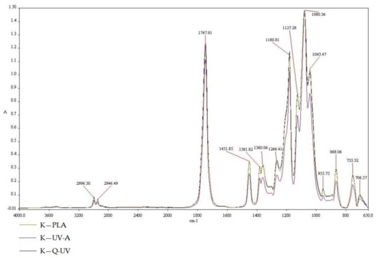 The FT-IR spectra of K—PLA, K—UV-A, K—Q-UV.