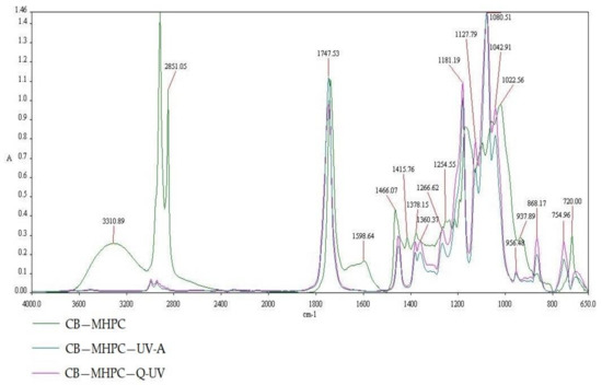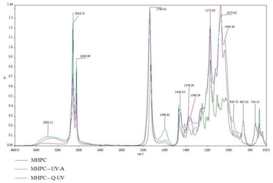The FT-IR spectra of MHPC, MHPC—UV-A, MHPC—Q-UV.