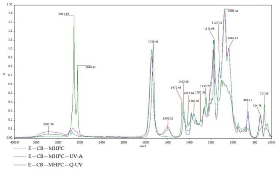 The FT-IR spectra of E—CB—MHPC, E—CB—MHPC—UV-A, E—CB—MHPC—Q-UV.