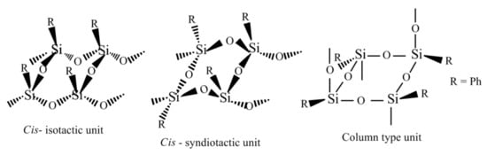 We recently reported polycondensation of all four isomers: all-cis, cis-trans-cis-, cis-cis-trans-, and all-trans-(tetrahydroxy)(tetraphenyl)cyclotetrasiloxanes [PhSi(OH)O]4 by another method, namely, in the presence of layered-architecture compounds. The formation of LPPSSO with different unit structures and column-type cyclolinear polyphenylsilsesquioxanes was observed [23,24]. For example, by means of copolycondensation of the all-cis- and cis-trans-cis-stereoisomers of [PhSi(OH)O]4 in solution in the presence of montmorillonite (MMT) in various ratios to the isomers, LPPSSO copolymers were obtained [25] Only two isomers of the four possible isomers, all-cis- and cis-trans-cis-[PhSi(OH)O]4, out formed the cis-isotactic and cis-syndiotactic CL PPSSO structures, respectively. However, in the case of the all-cis isomer when the reactions were conducted both with and without MMT cage-like oligomers also formed. With that, the cis-trans-cis isomer formed CL LPPSO with a higher Mw than the all-cis one. The all-trans isomer furnished column-type CL PSSO (Figure 1).