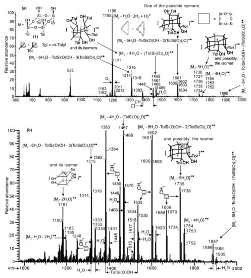 An interesting point of the spectra is worth discussion here. Monomer 1 was registered in the PI APCI spectrum as (M + H2O)+• rather than M+• (see the Experimental section), i.e., water was added immediately in the mass spectrometer. Whether or not this is valid for other compounds registered remains questionable. To throw some light on this, product 5 was treated with an excess of Me3SiCl and a mass spectrum recorded (Figure S3b in the SM). A shift by 72 Da to the higher masses was observed for the ionic groups with the nominal mass ions of 1314 and 1600 Da to give those of 1386 and 1672 Da. This indicated that the corresponding compounds contained a free OH group. At the same time, the groups with the nominal mass ions 1448 and 1734 proved to be unshifted. This speaks in favor of these compounds being closed-cage species bearing no OH groups, and water was added during the mass spectral analysis. The corresponding ions could have either hydrate structures: [((M3 − 6H2O) − (TolSi(O))2O) + H2O]+• and [(M3 − 6H2O) + H2O]+•, respectively, or hydrolysis of a Si–O bond occurred to furnish [M3 − 5H2O − (TolSi(O))2O)]+• and [M3 − 5H2O]+• with two adjacent OH groups. The same is probably valid for many other ions. For simplicity, the second variant is mostly employed in the labels in the mass spectra and the structures depicted therein.