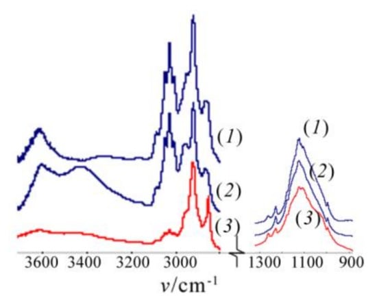 The IR spectra of products 3.1, 4, and 5 (Figure 6) exhibited an absorption band at 1123 cm−1 with a width ∆ν1/2 of 200 cm−1 in the region of asymmetrical stretching vibrations νas of the Si–O–Si bond. The IR spectra of products 3.1 and 4 also exhibited noticeable OH bands at 3400–3600 cm−1, while that of 5 was less pronounced. This supported the above MS results of the presence in these products of open-cage compounds with OH groups. Moreover, this is in good agreement with the findings that cage-like organosilsesquioxanes were characterized by an absorption band at 1122–1128 cm−1 [5].