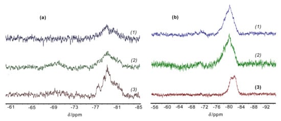 The 29Si NMR spectra of polymers 6–8 in the δ region of −76.0~−82.0 ppm were characterized by a single signal at δ −79.9 ppm with ∆δ1/2 = 3.0 ppm. The signals at δ −67.0~−71.0 ppm specific for ClC6H4Si(OH)O units were present but were very small in the spectra of polymers 8 and 9 (Figure 7b).