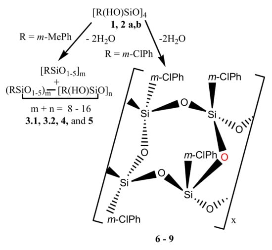 - Yamamoto, S.; Yasuda, N.; Ueyama, A.; Adachi, H.; Ishikawa, M. Mechanism for the formation of poly(phenylsilsesquioxane). Macromolecules 2004, 37, 2775–2778. [Google Scholar] [CrossRef]
