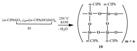 A comparison was made of the polymer 8 unit configuration order with that of CL ladder poly-m-chlorophenylsilsesquioxanes (LPClPSSO) (10). This polymer was synthesized by anionic polymerization in the presence of KOH at 250 °C of a prepolymer (11) obtained by hydrolysis of m-chlorophenyltrichlorosilane (Scheme 2) [1].