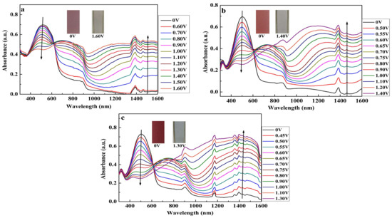 Electrochromic switching of P1 (a); P2 (b); and P3 (c) at different wavelengths.
