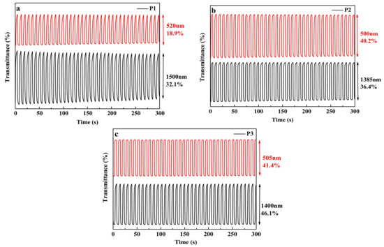 A kinetic study was conducted for the three polymers to explore their kinetic switching properties, including contrast ratios, response speeds, and stability [36]. For this propose, chronoabsorptometry was used by setting the potentials of the WE electrode (polymer coated ITO electrode) at the reduced potential and the oxidized potential for four seconds, respectively, and the transmittance ratio of the polymers was recorded simultaneously. For polymer P1, the contrast ratio (ΔT%) values were found to be 18.9% at 520 nm, and 32.1% at 1500 nm (Figure 6a). Response time (t95%) is usually defined as the time required fulfilling the 95% of the maximum contrast ratio (sensitive to naked eyes) [37]. From the calculation results, oxidation time was measured as 2.56 s at 520 nm, 2.44 s at 1500 nm for P1. The switching spectra of P2 and P3 were also presented in Figure 6b,c, respectively, and the calculated results are summarized in Table 2. It is apparent that ΔT% values increased from P1 to P3 in both the visible region and the near infrared region. The ΔT% values of P2 were slightly lower than that of P3, with P3 having a high ΔT% value of 41.4% at 505 nm and 46.1% at 1400 nm. As to the t95% value, the response time decreased continuously in the visible region from P1 to P3, particularly the 0.54s for P3 at 505 nm, which is a very fast response time among the polymer based electrochromic materials and can even meet the requirements of non-emissive displays for electrochromic materials [38,39]. However, the same phenomenon was not apparent in the NIR region, as P3 had a longer response time than that of P2. Thus, the high percent ratio of the ProDOT-decyl2 unit is helpful to improve the contrast ratios of the resultant conjugated polymers, as well as helpful to the response speeds in general.
