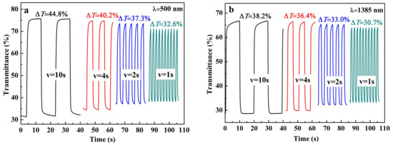 Besides, the changes in ΔT% values were also measured by changing the retention times from 10, 4, 2 to 1 s to assay the influence of the retention times on the contrast ratios of the polymers. For P2, the ΔT% values at 500 nm decreased from 44.8% (10 s), to 40.2% (4 s), 37.3% (2 s), and 32.6% (1 s) (Figure 7a). Meanwhile, the ΔT% values were recorded as 38.2%, 36.4%, 33.0%, and 30.7% at the retention times of 10, 4, 2 and 1 s, respectively, at the wavelength of 1385 nm (In the NIR region) (Figure 7b). As the retention times were decreased from 10 to 1 s, the ΔT% values were reduced by 26.74% and 19.63% at 500 and 1385 nm, respectively. For P1, the retention times had a greater impact on the ΔT% values than that of P2 (Figure S4). Specifically, the reduction rates were 52.96% and 58.1%, respectively, at 520 and 1500 nm, as the retention times changed from 10 to 1 s. Surprisingly, the reduction rate in contrast ratio for P3 was only 8% as the retention time changed from 10 to 1 s at 505 nm, which suggested the highest stability in optical contrast among the three polymers as the retention times decreased from 10 to 1 s (Figure S5). The contrast ratio of P3 at 1400 nm was reduced by 35.6% as the retention time changed from 10 to 1 s (Figure S5b), which was more sensitive to the changes in retention times than that of the shorter wavelength. The changes in the transmittance ratios are determined by the doping (oxidation) and dedoping (reduction) of the polymers, which is characterized by the diffuse into or diffuse out of the polymer films by the counter anions. In this case, the sensitivity of the contrast ratios to the retention times might have a relationship with the diffusion capacities of the counter anions in the polymer films. The high diffusion ability of the counter anion within the conjugated polymer might be helpful to keep the contrast ratios, even if the retention times have been changed in a larger range [41,42,43]. As discussed above, the stronger interaction forces between the segments of P1 might be anticipated rather than that of P2 and P3 due to the higher content of M2 units, which will lead to a more compact microstructure of P1 than that of the two other polymers. And as a result, the diffusion speed of the counter anion in P1 might be slower than in that of in P2 and P3, which could explain the different sensitivities of the contrast ratios to the retention times of three polymers.
