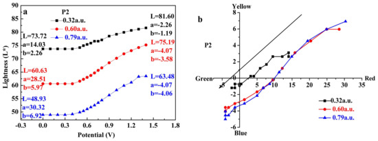 The CIE 1976 L*, a*, b* color space calculated from the transmittance spectra of the P2 at different biased potentials using air as a background is presented in Figure 8. Films with different thickness were used for the display of the changes in chromaticity. In the neutral state of the P2, the L*, a*, b* values increased with the increase of the thickness of the polymers (Figure 8a), which also applied to the P2 at oxidized states with different thickness.