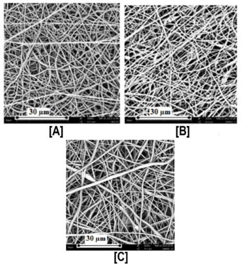 Electrospinning is a widely utilized technique to fabricate nanofibers with intricate architectures, making this process highly suitable for tissue engineering and environmental, energy, sensor, textile, food packaging, and agricultural applications [1,2,3]. Reasons for the widespread use of nanofibers include their large surface to volume ratio with high porosities, and very low weight, compared to bulk fibrous materials [4,5]. In addition to their nano-scale dimensions, electrospun nanofibers are of special interest in biomedical applications, as they imitate the native extracellular matrix of physiologic tissues [4,6]. Another advantage of nanofibers is their capability of delivering drugs that are otherwise impermeable to physiologic tissues [7]. Aliphatic polyesters belong to the biodegradable polymers that are currently widely used in various biomedical applications, including for treating orthopaedic, oral and maxillofacial, and neurological ailments [4,8]. Despite their potential in various medical applications, aliphatic polyesters lack surface epitopes, have poor biomechanical properties (low modulus or brittleness, for example), and longer degradation times (polycaprolactone, for example), thereby necessitating the incorporation of additional molecules to modulate these characteristics [4].