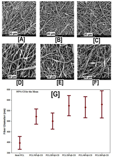 Scanning Electron Micrographs (SEM) of PCL and PCL/γ-CD functionalized nanofibers. By simply adjusting the PCL concentration from 14% to 12%, an increase in γ-CD loading (from 15% to upwards of 30%) was made possible without significant increases in the beaded structures in the nanofibers (A–C). Images adapted and reproduced with permission from [42]. Copyright American Chemical Society 2014.