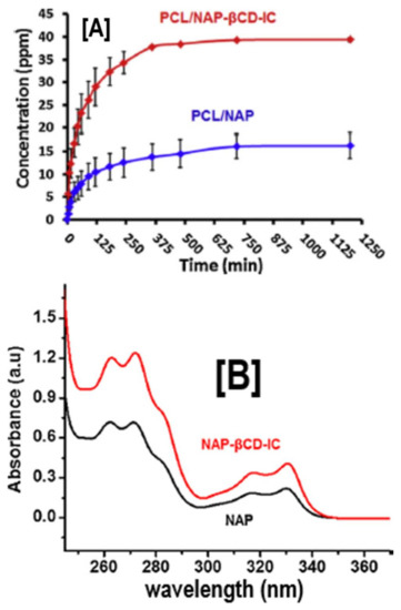 The release and solubility profiles of naproxen (NAP) from PCL and PCL/β-CD-IC nanofibers. The release profile study (A) by HPLC revealed significant release of NAP from PCL/NAP-β-CD-IC, compared to the PCL/NAP nanofibers, owing to improved solubility of encapsulated NAP, compared to pristine NAP. These results were further corroborated by solubility analyses (UV-vis) (B), which showed significantly enhanced solubility, as observed by increases in the intensity. Images adapted and reproduced from [63]. Copyright Elsevier Ltd., 2014.