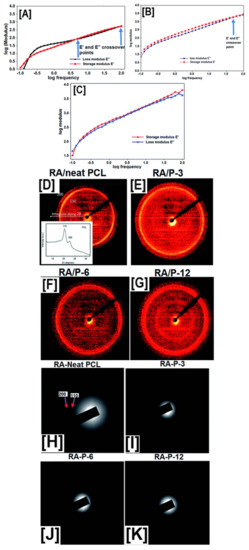 Establishing structure property relationships between pseudorotaxane (PpR) solution rheology and the resultant molecular arrangement of PpR in the nanofibers. Solution rheology of neat PCL solutions at higher concentrations (12%) showed low modulus values (elastic and loss) with multiple cross-over points, typical of viscoelastic material. On the other hand, PpR solutions showed frequent cross-over points, indicating a Rouse–Zimm effect (A–C). However, both 2D-wide angle X-ray diffraction (D–G) and selected area electron diffraction analyses (H–K) showed the presence of crystalline domains in both randomly aligned, as well as aligned PCL nanofibers, while no such peaks were evidently observed in PpR nanofibers. Images adapted and reproduced with permission from [97]. Copyright The Royal Society of America 2016.