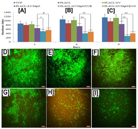 Proliferation and cell densities of Michigan Cancer Foundation-7 (MCF-7) cells on poly(lactide-co-caprolactone) (PLCL or PLACL) scaffolds and PLCL scaffolds containing aloe vera (AV), magnesium oxide (MgO), and free curcumin (CUR), or encapsulated in β-CD. The addition of AV alone did not cause MCF-7 cell death at all studied time points; however, the addition of CUR, in either free or encapsulated form, resulted in significant cell death of the proliferating MCF-7 cells (A). These results were further corroborated by laser confocal scanning microscopy measurements, which showed low cell densities in scaffolds containing CUR and MgO/CUR (11 B: (E,F)). Images adapted and reproduced with permission from [109]. Copyright Elsevier Ltd., 2017.
