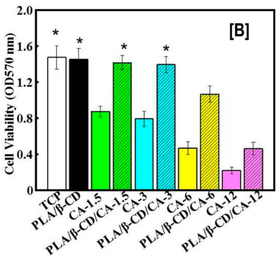 Similar to the study of HCPT for treating cancer, curcumin (CUR) encapsulated in β-CD carried by poly(lactide-co-caprolactone) PLCL nanofibers, in conjunction with other biologics, such as aloe vera (AV) and magnesium oxide (MgO) nanoparticles, have been evaluated for treating breast cancer [109]. In vitro proliferation evaluation of the composite fibers of breast cancer cell line, MCF-7 (Michigan Cancer Foundation-7), by MTS assay (3-(4,5-dimethylthiazol-2-yl)-5-(3-carboxymethoxyphenyl)-2-(4-sulfophenyl)-2H-tetrazolium, inner salt) showed a significant reduction in cell numbers (p < 0.01) after 6- and 9-days, with either free or encapsulated CUR (PLCL/AV/MgO/CUR and PLCL/AV/MgO/CUR/β-CD scaffolds) (Figure 11B,C) [109]. These results were corroborated by laser confocal scanning microscopy images of fluorescent dye 5-chloromethylfluoresceindiacetate (CMFDA) (chloromethyl derivatives)-labelled MCF-7 cells, which showed decreased cell densities in scaffolds containing free or encapsulated curcumin, compared to the scaffolds that did not contain curcumin (PLCL/AV, PLCL/MgO, and controls) (Figure 11D–G) [109]. In addition, CUR-containing scaffolds (PLCL/AV/MgO/CUR and PLCL/AV/MgO/CUR/β-CD) showed a drastic reduction in collagen secretion, indicating poor proliferation of MCF-7 cells, due to the presence of CUR/β-CD, and showing a synergistic effect of CD/drugs delivered via PLA-based nanofibers (Figure 11H,I) [109].