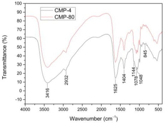 IR spectra of CMPs extracted with different temperatures showed very similar absorption bands (Figure 2). Three characteristic absorption bands of the polysaccharides were displayed in the IR spectrums: a broad band at around 3416 cm−1 attributed to O–H stretching vibrations, a weak band at around 2932 cm−1 due to C–H stretching vibrations, and a band at around 1404 cm−1 attributed to the C–H bending vibrations. In addition, the strong absorption band at around 1625 cm−1 was derived from C=O stretching vibrations. The absorption bands in the range of 1144–1048 cm−1 could be assigned to the stretching and bending vibrations of C–O, C–C and C–O–C, and C–O–H, indicating the presence of pyranose rings, and the band at around 845 cm−1 suggested the presence of α-type glycosidic linkages in CMPs. This observation was consistent with the results of Zhu et al. [21], who indicated that the polysaccharides (CMPS-II and CBPS-II), isolated from the cultivated fruiting body and mycelium of C. militaris, mainly contained mannose, glucose, and galactose with α-type glycosidic linkages. The IR spectrums of CMPs-4 and CMPs-80 were almost identical only with a slight difference in the intensity of bands, indicating that different extraction temperatures had no distinct effect on sugar rings or the category of glycosidic linkages of polysaccharides, which coincided with the analysis of monosaccharide composition.