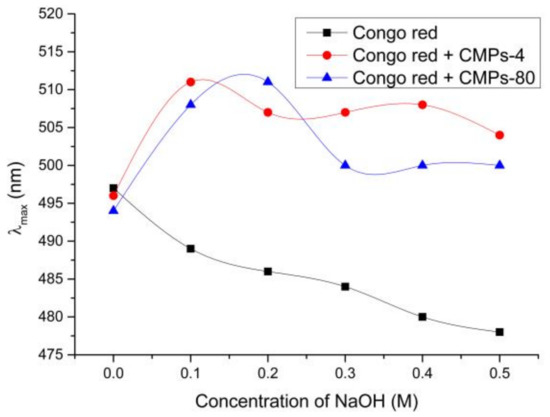 Congo red, an acid dye, can interact with polysaccharides with triple-helical conformations to form complexes, leading to a bathochromic shift of the absorption maximum [22]. Figure 3 displays the maximum absorption wavelength (λmax) of Congo red in the absence or presence of CMPs-4 and CMPs-80. The results showed that the λmax of Congo red CMP complexes exhibited a significant transition into longer wavelengths in the weak alkaline solution (<0.20 M NaOH), indicating the existence of a triple helix configuration in both CMPs-4 and CMPs-80. However, when the NaOH concentration was higher than 0.2 M, the λmax of Congo red CMP-80 complexes declined sharply, which might be due to the shift of space spiral structures to single flexible chains [23]. For CMPs-4, a small fluctuation was observed in the transition process of λmax with the alkaline concentration increasing, which is probably because the CMP-4 fractions extracted with cold water could maintain a stable triple helical structure in the high concentration of alkaline solutions. Further research is still needed to explain the phenomenon.