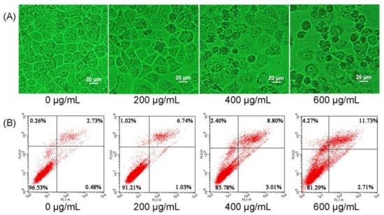 Eca-109 cells (8 × 104 cells/mL) were inoculated into 6-well plates and treated with different concentrations (0, 200, 400, and 600 μg/mL) of CMPs-4. After 24 h, the morphological changes of Eca-109 cells were observed under an inverted optical microscope (ECLIPSE Ti, Nikon, Tokyo, Japan).