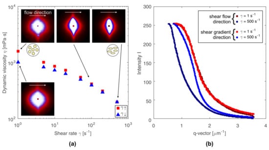 Scattering patterns presented in Figure 1a show the distribution of scattering intensity on the plane of scattering vector q, for the initial (γ̇ = 1 s−1), intermediate (γ̇ = 100 s−1), and final (γ̇ = 500 s−1) states during the measurement at increasing shear rate. Figure 1a also shows the scattering pattern obtained at shear rate of 1 s−1 during the test of decreasing shear rate. The differences in the scattering patterns obtained for initial and final state result from the thixotropic properties of the medium. It is possible to observe a change in the shape of the scattering pattern from circular to elliptical with increasing shear rate and a simultaneous decrease in viscosity. This change represents orientations and deformations of the polymer domains [24,25,26].