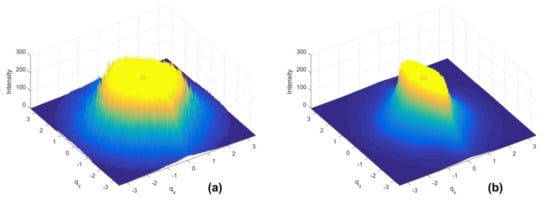 Three-dimensional distribution of light intensity on the scattering vector plane for 2.5% (w/w) chitosan solution at 40 °C. (a) Data for shear rate 1 s−1. (b) Data for shear rate 500 s−1.