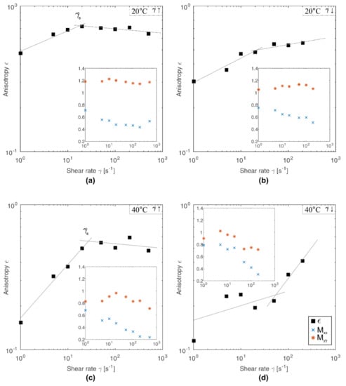 Changes in anisotropy ϵ as a function of shear rate. The inner plot show changes in the second-order tensors Mxx and Myy as a shear rate function. Measurements were made for increasing (γ̇↑) and decreasing (γ̇↓) shear rates.