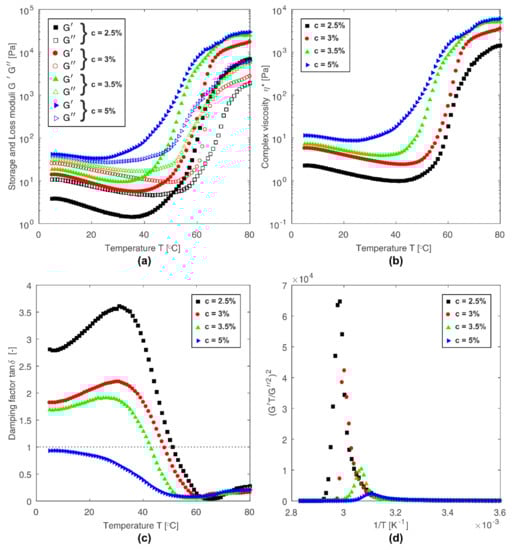 An alternative approach to determine the gelation point based on rheological data is the method described by Fredrickson-Larson (F-L) [33,34]. According to the F-L theory, the ratio (G’T/G”2)2 as a function of inverse temperature 1/T demonstrates divergence behavior near the gelation point. The peak positions of the curves depicted in Figure 4d determine the gelation temperature. The determined temperatures of phase transition according to F-L theory reveal a decrease of gelation temperature with an increase of concentration of chitosan solutions. However, these values are slightly higher than those determined based on the crossover point of G’ and G” moduli (Figure 4c).