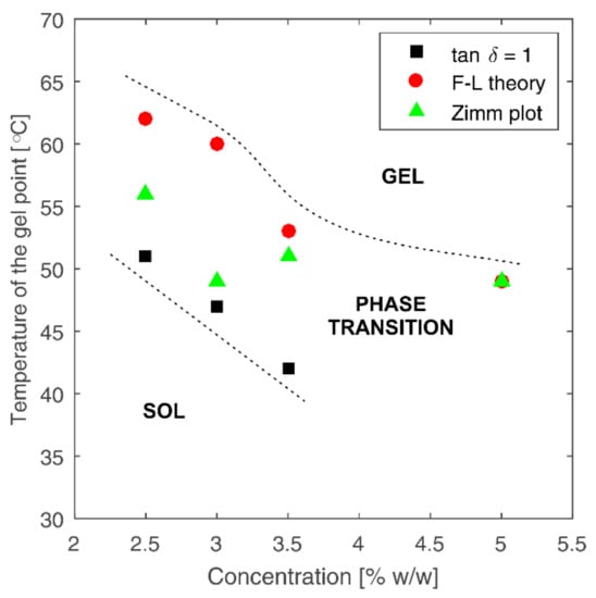 A comparison of phase transition temperatures determined by various methods for different chitosan concentrations is shown in Figure 5. Gelation temperatures determined by the crossover point of the curves of moduli G’ and G” (tanδ = 1) show the lowest values. For the 5% solution, it was not possible to determine the gelation point using this method, because the value of storage modulus G’ was higher than that of loss modulus G” (tanδ = G”/G’ < 1) in the entire temperature region covered in conducted measurements. Gelation points determined by other methods, i.e., the F-L theory and Zimm plot, yield similar values of gelation temperature for higher concentrations (3.5 and 5%). Based on the gelation temperatures presented in Figure 5, three characteristic phase areas for the investigated process can be distinguished. The initial sol phase is separated from the final gel phase by the phase transition area in which a rapid increase in the values of dynamic moduli of the tested medium occurs.