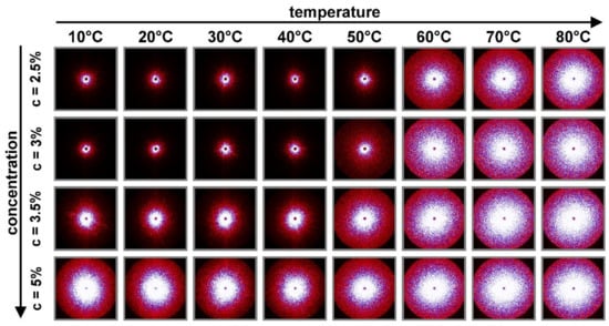 Simultaneous registration of light scattering data during rheological tests allows one to gain wider insight into phase transition process. Figure 6 shows the resulting light scattering patterns depending on temperature and concentration. As can be seen, the intensity increases with increasing temperature and concentration. This increase of intensity may result from increase in the number of scatters that depend on the concentration and temperature. Some of the researchers [32,37,38] investigating the phenomenon of phase transitions reported similar behavior of scattering pattern and explain it as a signature of formation of multi-chain associations.