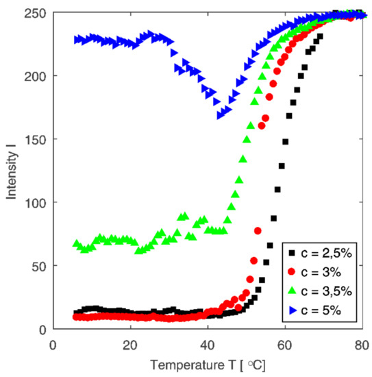 Figure 7 shows the temperature evolution of intensity for a fixed value of scattering vector (q = 1.5 μm) for four tested samples at different concentrations. The evolution of intensity curves shows similarity to rheological data (cf. Figure 4b). The higher the solution concentration, the higher the intensity in the initial phase of the process. The phase transition can be observed as a rapid increase in intensity. The shape of curves with distinctive inflection point shown in Figure 7 is similar to the shape of curves representing changes in complex viscosity as a function of temperature shown in Figure 4b. The exception is the intensity curve for the most concentrated chitosan solution, which, in contrast to the other tested solutions, shows predominance of elastic properties over viscous ones in the entire considered temperature range.