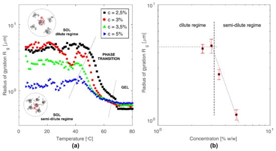 (a) Changes in the radius of gyration as a function of temperature for all tested concentrations of colloidal chitosan solutions. (b) Changes in the radius of gyration expressed as an average value of gyration radii at the initial phase of the process (sol) as a function of concentrations of colloidal chitosan solutions.