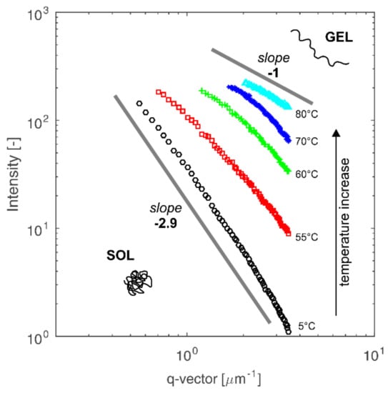In the wave vector region covered in these measurements, the power law (I(q)~q-n) can describe the q dependence of the light intensity. In the wave vector regime qRg > 1, the experiment probes the cluster fractal dimension, and the value of the power exponent n provides structural information on the fractal dimension of molecules [27,28]. Based on data of the scattering pattern at 20 °C for the lowest shear rate, the value of exponent n was approximately ~2.7. This value indicates that the polymer chains have an intermediate conformation between a collapsed coil (n = 3) and swollen Gaussian coil (n = 2). Molecules formed in this manner are deformed by shear forces, and the resulting scattering pattern reveals more prominent anisotropy for higher shear rate values (Figure 2b).