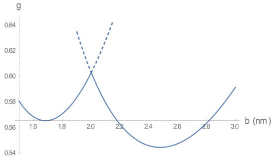 The free energy (per bead, in units of T) as a function of bead spacing for a Bjerrum length l = 2.0 nm lying within the transition range in Figure 2; the spring constant and salt concentration are the same as in Figure 2. g = (b) for b < 2.0 nm, g = (b) for b > 2.0 nm. The dashed continuations are forbidden, so there is a maximum at l = 2.0 nm