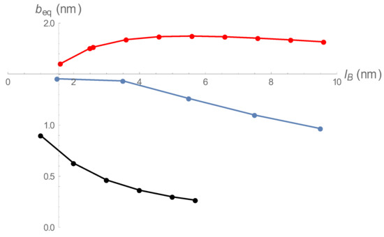 Figure 2 is a representative plot of as a function of Bjerrum length for both regions. The black points are roots of , and the red points are roots of . All points of the black curve satisfy , and all points on the red curve satisfy . For the conditions of Figure 2, there is an overlap range 1.60 nm 2.53 nm. For a given Bjerrum length in this range, there are two equilibrium spring lengths, a relatively stretched one (black) with no condensed counterions, and a relatively contracted one (red) with condensed counterions.