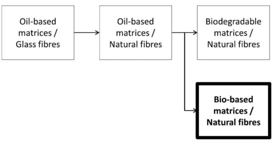 A schematic evolution of composite materials from synthetic fibers, such as glass fibers (GF), to greener materials, is represented in Figure 1.