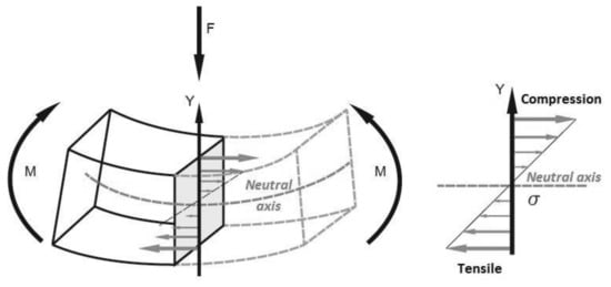 A higher enhancement of the flexural strength than that observed for tensile strength of the same composites has been observed []. This difference between tensile and flexural strength enhancements is related to the specimens working at tensile and compression loads during the bending test as opposed to pure tensile loads (Figure 2).