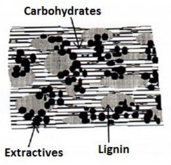 The flexural strength and its evolution, with respect to the reinforcement content, are related to the formation of a suitable interface. In PA11-SGW composites, this interface is produced by the capacity of the PA11 to interact with the SGW fibers by H-bonds and other intermolecular forces in addition to mechanical anchorage. The SGW fibers used in this work are mechanical fibers from pine, obtained through high-yield processes, and the chemical composition of such fibers (i.e., the carbohydrates, lignin, and extractives) and their distribution along the section is slightly affected by the process. Lignin and extractives are usually found in the most superficial layers of the fiber and can inhibit the interaction between the cellulosic chains and the polymer [,]. Böras and Gantenholm [] proposed a simple schematic model for the chemical distribution on the surface of a mechanical fiber (Figure 3).