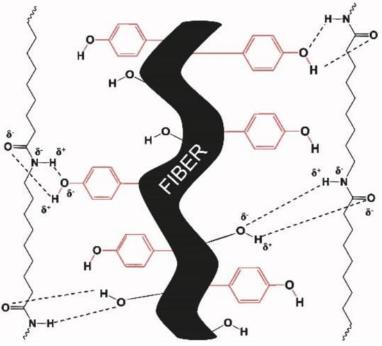 In this model, the largest area corresponded to lignin (28%) and extractives (32%), and only 40% of the available surface was covered by carbohydrates (cellulose and hemicellulose). In the case of SGW fibers, the cellulose and hemicellulose surface available could be slightly reduced. The lignin content on the surface was expected to be slightly higher than that obtained for thermomechanical treated fibers from softwood []. Apart from cellulose and hemicellulose, lignin has also a considerable percentage of hydroxyl groups in its structure, allowing its interaction with the PA11 matrix. A scheme of the interface of PA11 and SGW fibers is proposed in Figure 4. The figure describes a fiber surface with hydroxyl groups from lignin (phenol groups) and carbohydrates available at the fiber surface that can interact with the PA11 matrix.