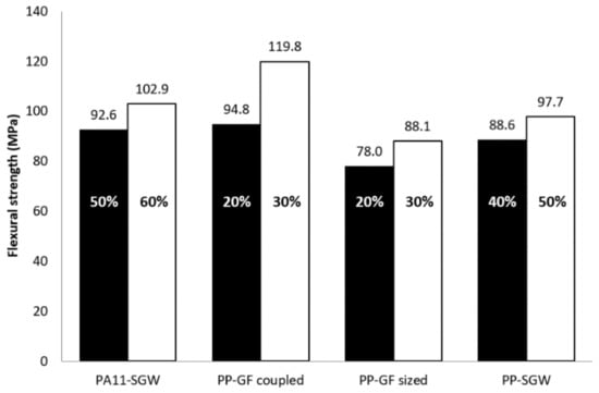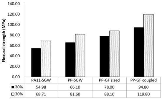 In order to assess the competitiveness of PA11-based composites, it is important to compare their flexural strength with those commercially available materials, such as PP-GF and PP-natural fiber composites. PP-GF composites, processes by injection-molding, are usually reinforced up to 20–30% w/w. In the Figure 6, the flexural strength of PA11-SGW was compared with the values obtained in previous works for PP-SGW [] and PP-GF [] composites at the same fiber contents (20–30%). The difference between PP-GF-sized and -coupled composites is the use of GF surface modifications in the case of GF-sized composites and the addition of a coupling agent in the formulation of coupled composites.