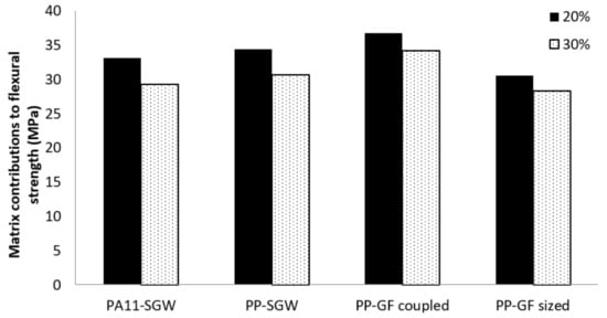 Matrix contribution of PA11-SGW and PP-based composites with 20% and 30% fiber content.