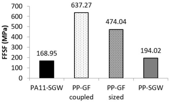 In the above, the FFSF is the slope of the regression curve obtained from the representation of σf − (1 − VF)·σfm* vs. VF []. The value of FFSF is unique for a family of composites, as its value does not change with the amount of reinforcement due to its dependence on the fiber properties and its interaction with the matrix. The FFSF of PA11-SGW composites was calculated and compared with those of PP-based composites obtained from the literature [,,,] (Figure 8).